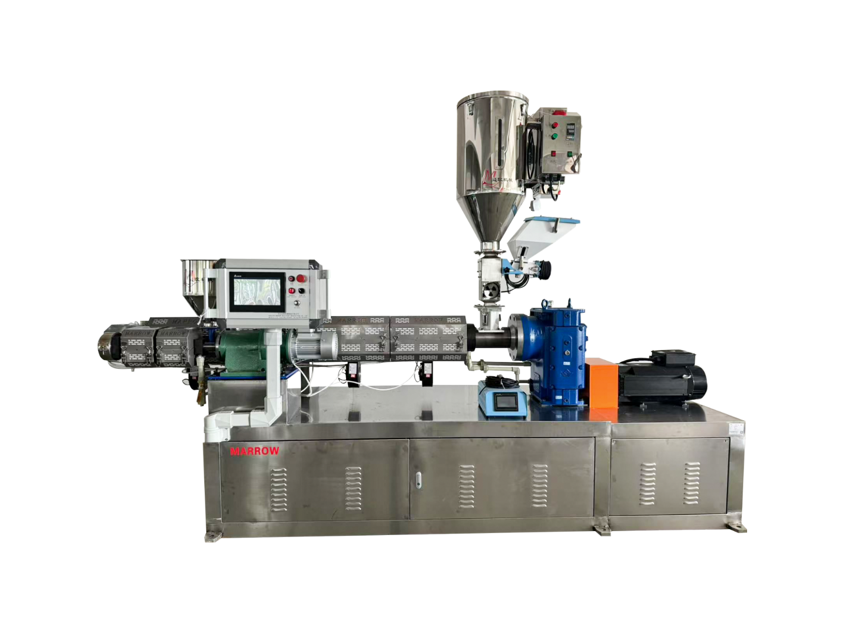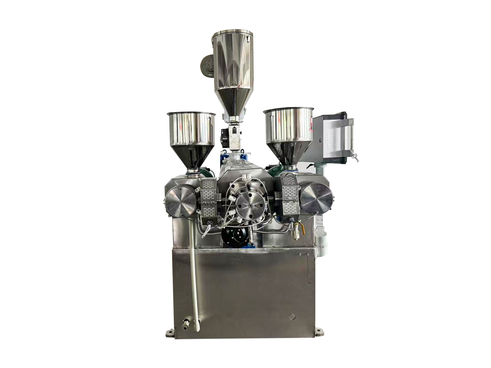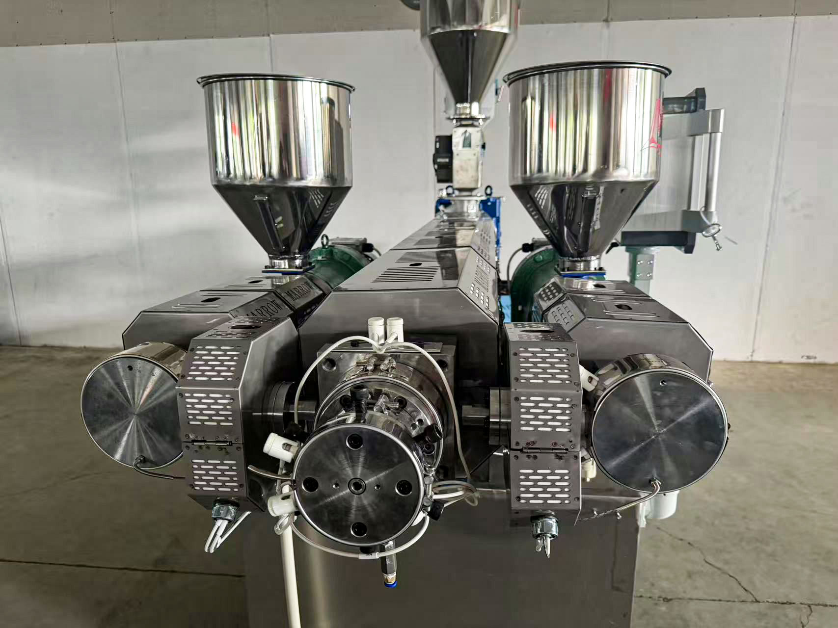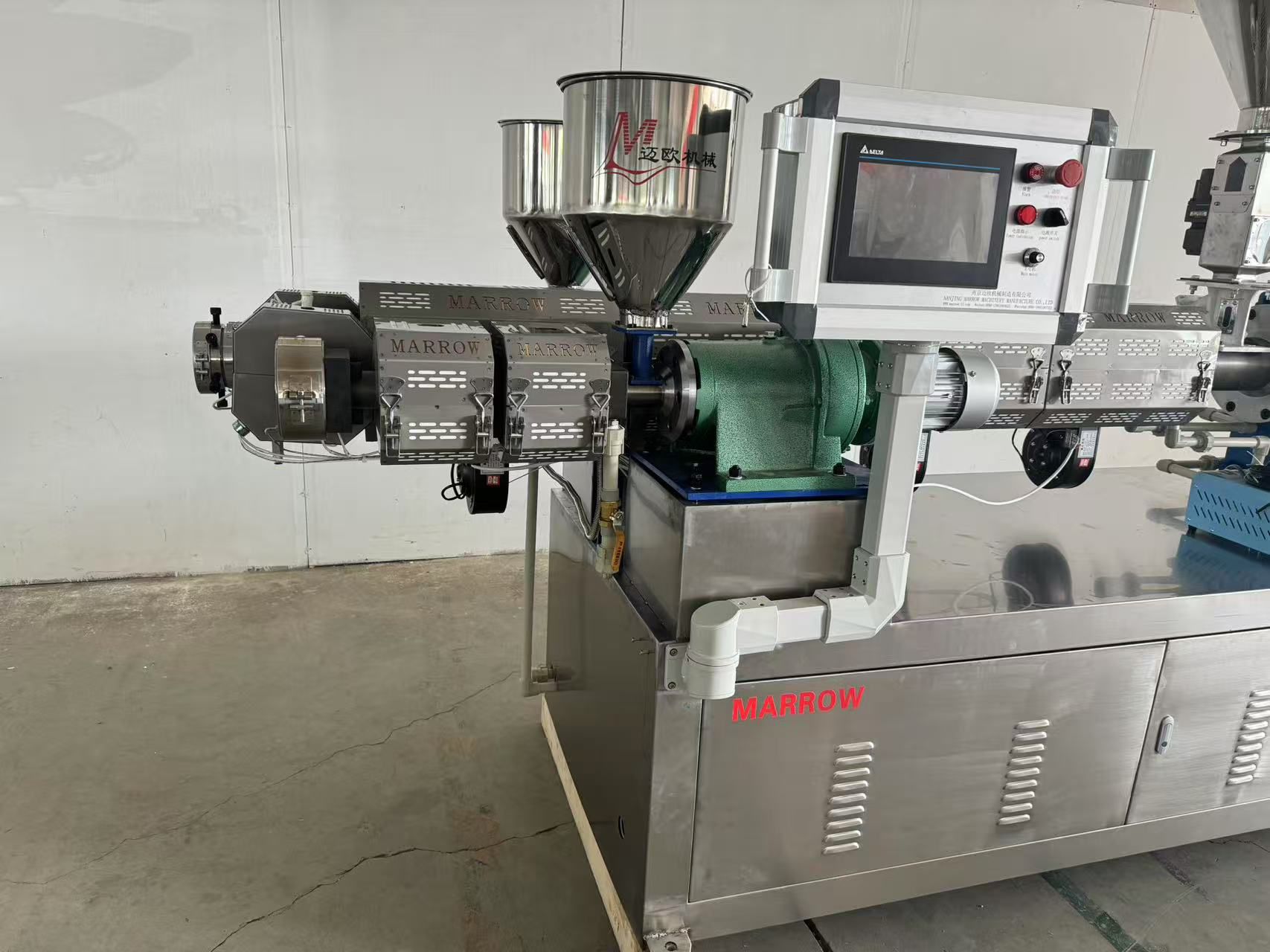 ML13-65 PLA/PLC 三色吸管擠出機組由:擠出機、機頭、冷卻定型裝置、牽引切割裝置、理管輸送裝置(選配)等部分組成,可實現(xiàn):單色擠出,多色共擠等多種配置。采用全新BM分離型參數(shù)設計的PLA料專用65mm直徑螺桿:長徑比33:1,塑化效果好,擠出量大,出膠穩(wěn)定;采用173型硬齒面齒輪箱,30kw高效節(jié)能同步伺服電機,塑化效果好,擠出量大,出膠穩(wěn)定;是生產(chǎn)PLA材料飲料吸管的專業(yè)設備,也可以滿足普通PP料吸管的生產(chǎn)。